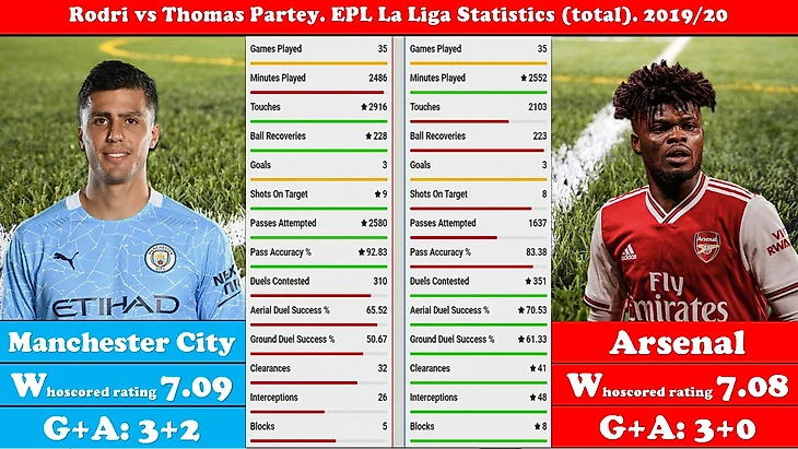 В последнее время болельщики Арсенала только и говорят про звездного новичка команды Томаса Парти. Мы говорим Арсенал, подразумеваем Парти... Сравним статистику Парти и его коллеги по позиции в Манчестер Сити - Родри в сезоне 2019/20.