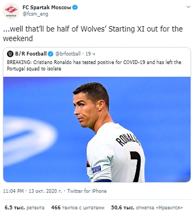 Англоязычный аккаунт “Спартака” в Twitter накануне высмеял новость о подтверждении у Криштиану Роналду коронавируса.