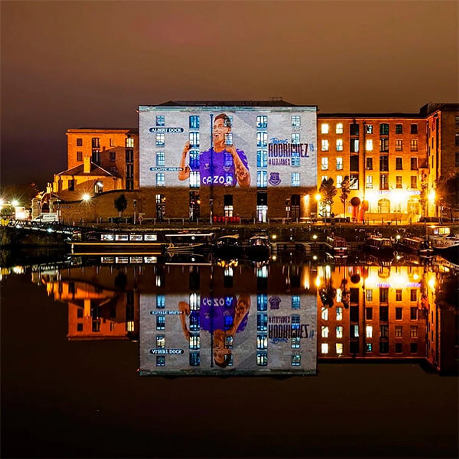 О локальных фанатах тоже не забыли. Несколько зданий в Ливерпуле подсветили голограммами Хамеса.