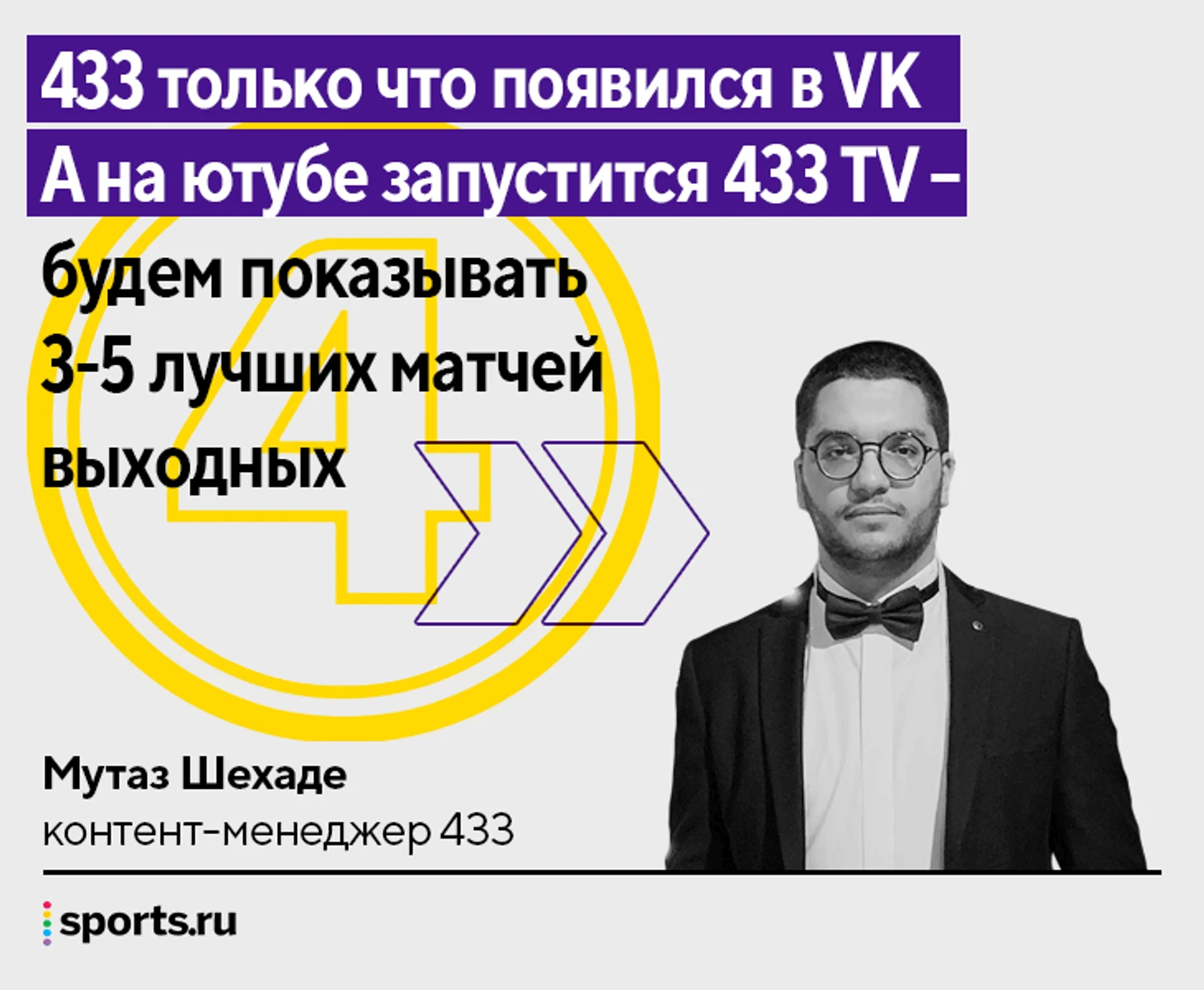 Теперь поговорим о 433 изнутри – контент-менеджер Мутаз Шехаде, который как раз и организовывает выход мирового аккаунта на российскую территорию, объяснил для Sports.ru детали.
