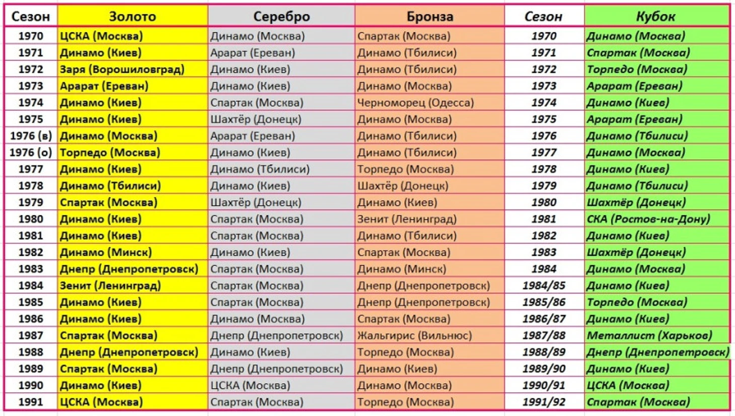Просто взгляните на то, кто становился чемпионом СССР по футболу с 1970-го по 1991 год включительно: