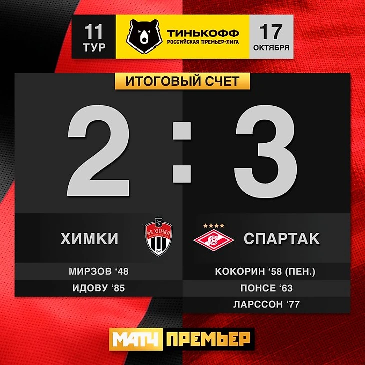До перерыва красно-белые бледно выглядели в атаке. Самый острый эпизод у ворот «Химок» возник, когда Понсе укрывал мяч корпусом и упал после контакта с соперником, дернувшим его за футболку, но судья пенальти не назначил.
