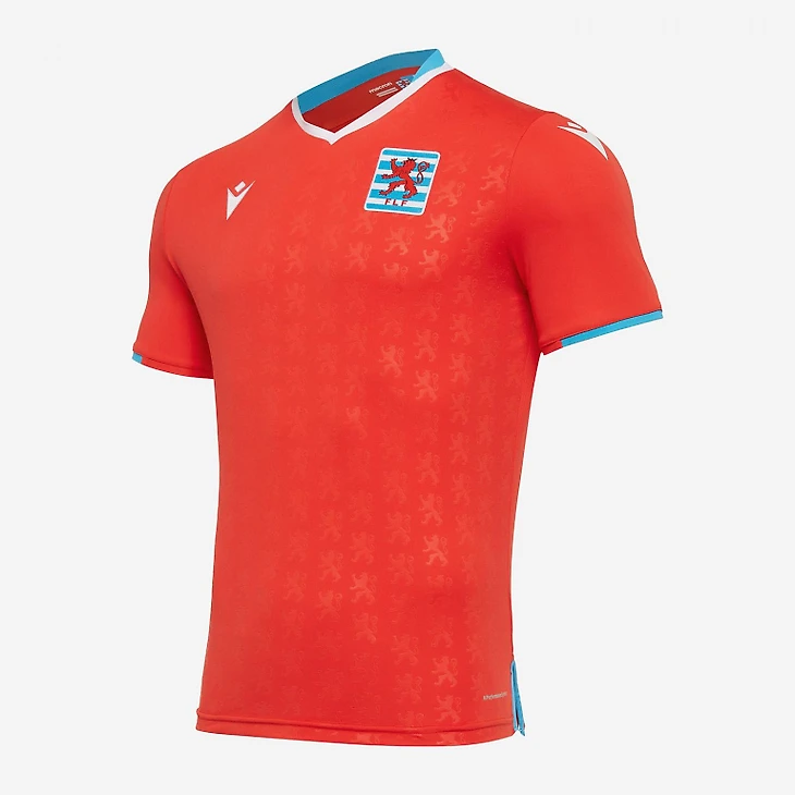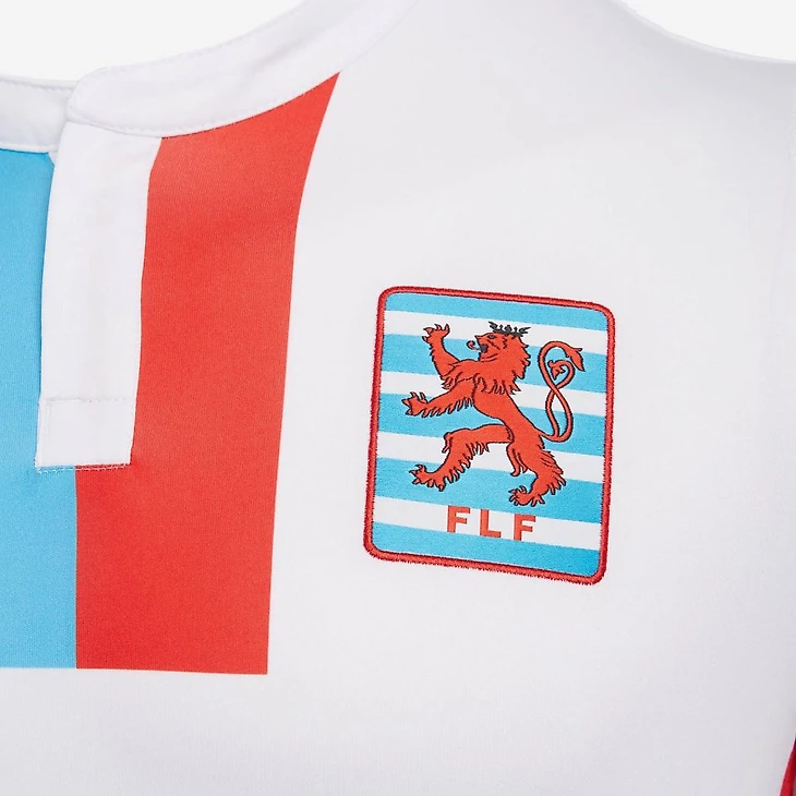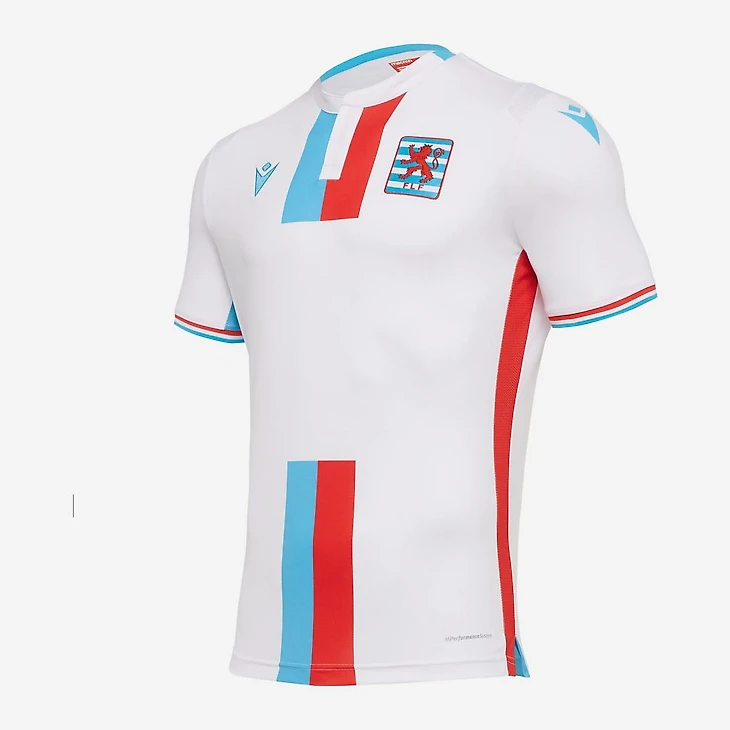 Гостевая форма выполнена в цветах флага Люксембурга. Фраза «ROUDE LÉIW HUËL SE» также находится на верхней части спины.