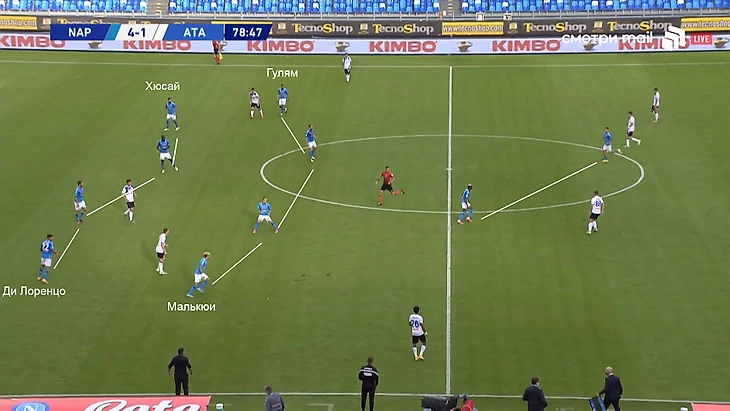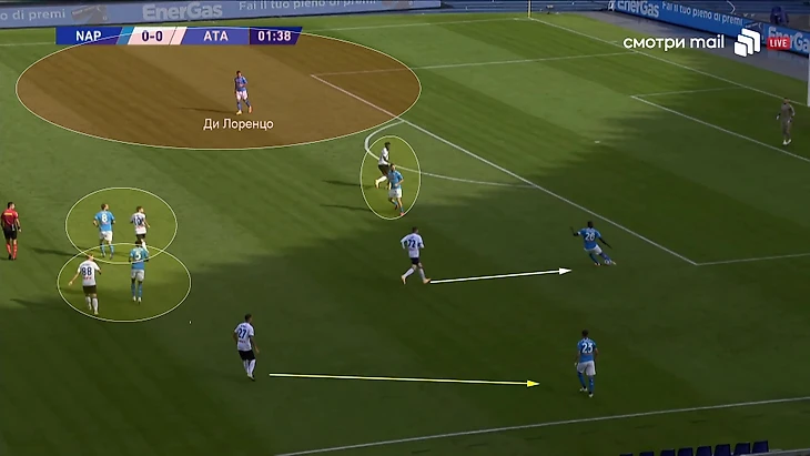 «Наполи» был готов к любому выбору. Первый сценарий: латераль остается на своей половине поля. Тогда «Наполи» выходил из-под прессинга через свободных Ди Лоренцо или Хюсая: