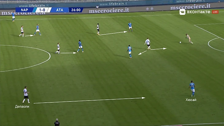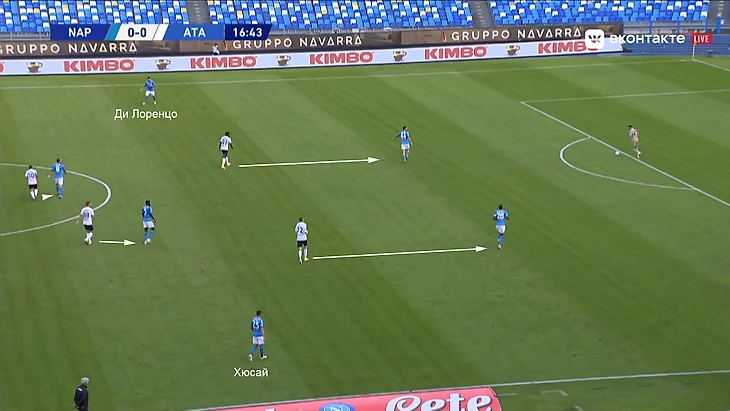 «Наполи» максимизировал расстояние между крайним защитником и вингером (Ди Лоренцо и Политано на одном краю, Хюсай и Лосано – на другом). Ди Лоренцо и Хюсай при розыгрышах располагались очень низко (что необычно для «Наполи» и вообще любой команды, но идеально подходило против «Аталанты»):