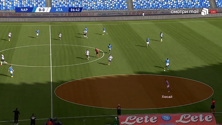 Вот пример из второго гола. Латераль Депаоли выдвинулся на чужую половину поля и готов накрывать Хюсая в случае паса. Оспина играет прямым пасом на Осимхена: