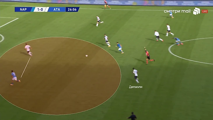 Осимхен переиграл оппонента, атака идет именно через ту зону, которую оставил Депаоли для изначального выдвижения: