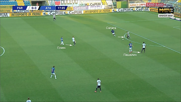 Вингеры в этот момент вне кадра, но они располагаются в высокой позиции и не стягиваются к мячу. Результат: латерали «Аталанты» не могут находится в промежуточной позиции. Они вынуждены выбирать.