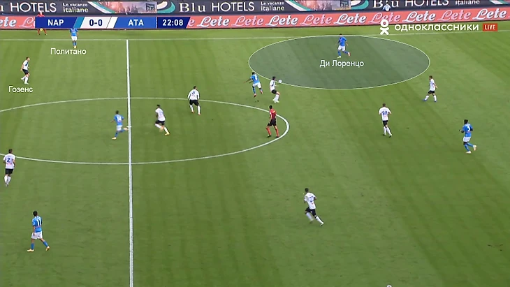 В первом голе проявились элементы этого приема. Латераль Гозенс играет по Политано (глубоко). Свободный Ди Лоренцо получает мяч и продвигает его на чужую половину поля (а потом еще сделает рывок на голевую передачу):