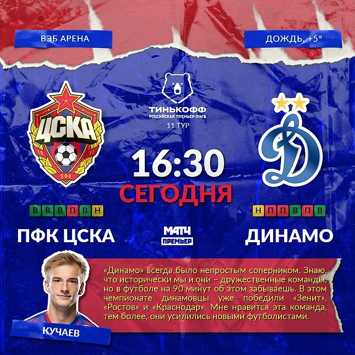 Матч между ЦСКА и "Динамо" пройдет сегодня в Москве на ВЭБ Арене. Начало встречи в 16:30 по московскому времени. ЦСКА занимает в турнирной таблице четвертое место, набрав 19 очков после 10 туров. У "Динамо" 17 очков и седьмое место. Кучаев в нынешнем сезона забил за ЦСКА четыре гола и отдал одну голевую передачу.