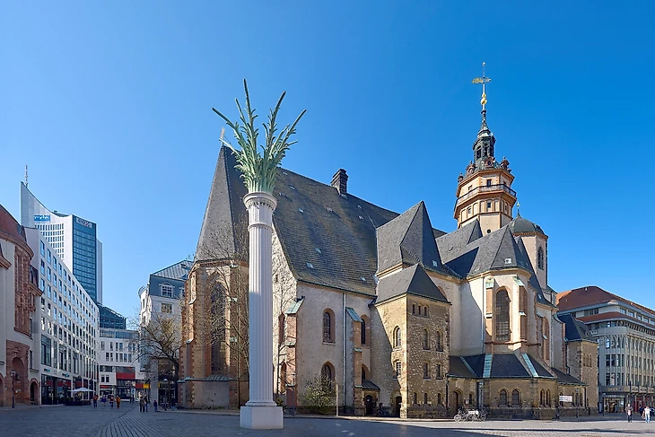 В нескольким минутах ходьбы от ратуши находится одна из старейших церквей Лейпцига, возведенная в XII столетии. За многовековую историю, чего только не происходило под сводами церкви Святого Николая: и Бах свои произведения исполнял и активисты по объединению Восточной и Западной Германии собирались.