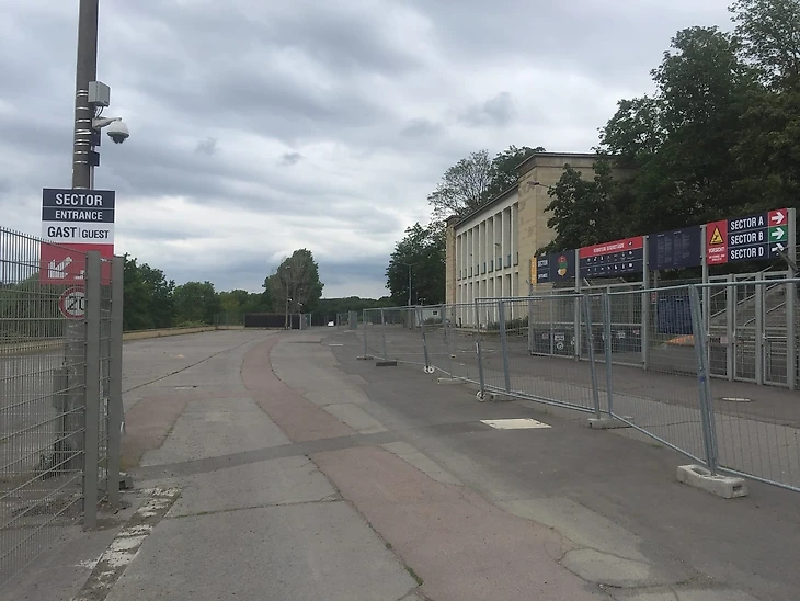 А вот это виды на окрестности стадиона в обычный день. Кругом не особо эстетичные заборы и запрещающие знаки с видеокамерами. При этом, архитектурные элементы, оставшиеся от старого стадиона, все-еще смотрятся внушительно и не дают этому месту стать совсем унылым: