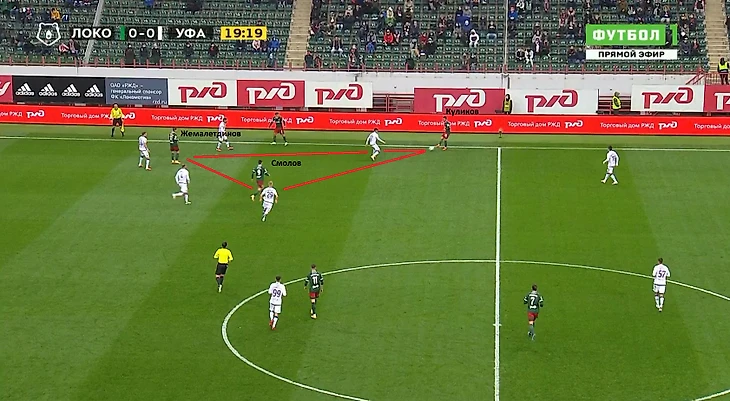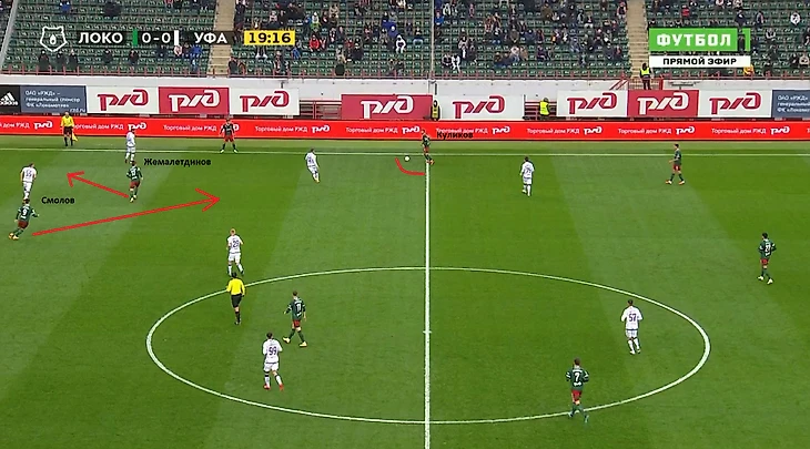 4. В первом тайме "Локо" прессинговал "Уфу" только при розыгрыше ударов от ворот, не давая строить атаки прямо от своих ворот, а вынуждая делать длинные передачи. В остальных случаях "Локо" размещался компактными линиями на своей половине поля, а защитники "уфимцев" могли разыгрывать мяч на своей половине поля без особых препятствий. Результатом таких розыгрышей становились длинные диагональные передачи вперед, где защитники "Локо" выигрывали борьбу.