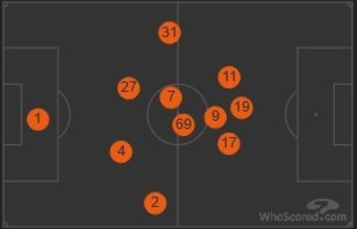 1. Как мы уже привыкли, "Локо" играл по схеме 4-4-2 в обороне, в атаке все выглядело несколько иначе. И напоминало больше схему 4-2-1-2-1. Потому что Смолов часто действовал ниже Жемалетдинова и Миранчука, особенно в первом тайме. Вот усредненная схема расположения игроков от WhoScored.