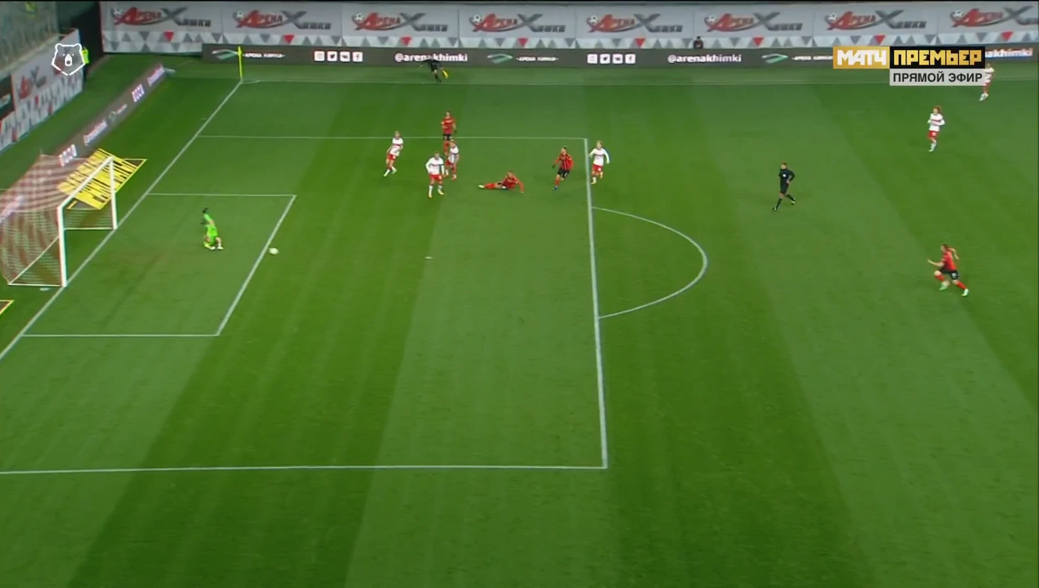 Мирзов прокидывает мяч мимо Маслова. Защитнику ничего не остается, кроме как грубо остановить опасный проход кивком руки в сторону шеи. Заслуженная желтая карточка.