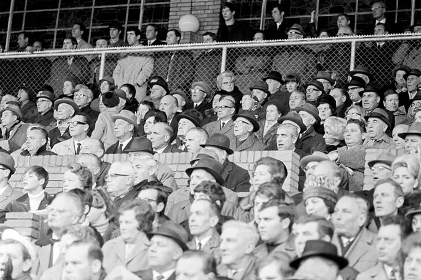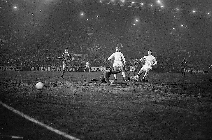 20 ноября 1966-го, Амстердам. За игрой между «Аяксом» и «Телстар» (4:2) наблюдает тренер «Ливерпуля» Билл Шенкли (в ряду за кирпичной стенкой четвертый человек слева, без шляпы). Председатель «Аякса» Яап ван Праг – правее в том же ряду через двух зрителей от Шенкли
