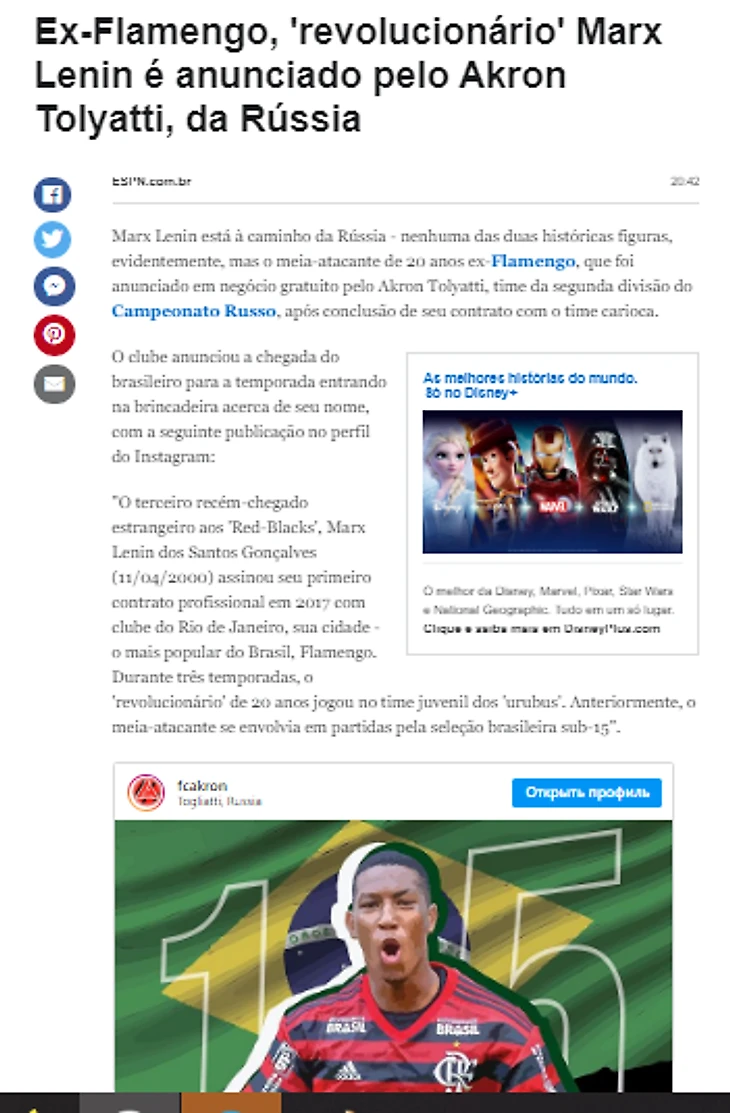 Переход 20-летнего воспитанника «Фламенго» Маркса Ленина в российский клуб стал новостью для зарубежных СМИ, заметивших в этом трансфере явный символизм.
