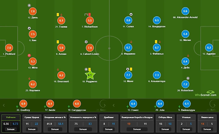 Лучшим игроком матча в составах обеих команд был назван Хамес Родригес. В целом, это оправданное решение, с которым нужно согласиться. В составе "Эвертона" хороший матч провёл Люка Динь, получивший после замены Коулмана капитанскую повязку. Возможно, его оценка была бы ещё на пару десятых выше, но именно из его зоны Джордан Хендерсон совершил подачу, вскоре после которой был забит второй гол гостей.