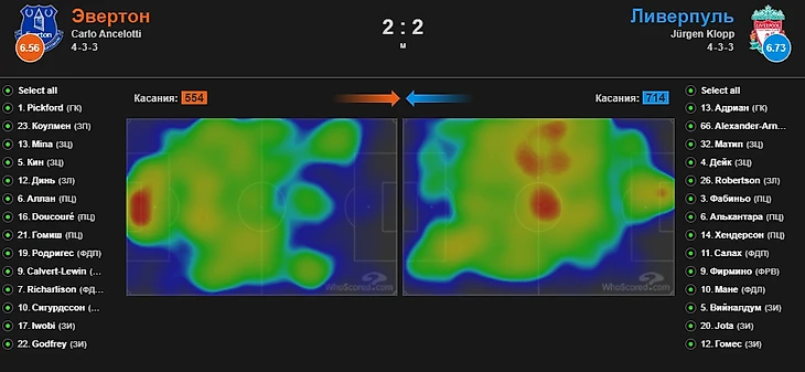 Эта карта доказывает, что именно "Ливерпуль" играл первым номером и бОльшую часть времени владел и мячом, и пространством. Игроки "Эвертона" чаще всего находились в своей штрафной площади, не давая "Ливерпулю" возможности часто наносить удары из её пределов. Самым активным местом "красных" была зона, в которой играл Тиаго, дирижировавший атаками своей команды. По итогу матча владение мячом составило 42% на 58% в пользу гостей. По первому впечатлению казалось, что разница в количестве касаний будет большей, однако конец первого тайма немного выравнял этот показатель.