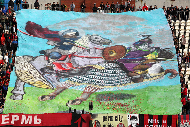 Пожалуй, самый красивый баннер, выполненный руками фанов «красно-чёрных», длинной практически в целый сектор. Вообще ко встрече с «Рубином» пермская торсида подготовилась основательно, и об этом пойдёт речь немного ниже.