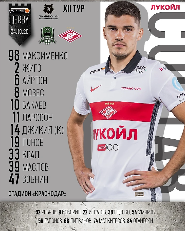 Состав «Спартака» в матче с «Краснодаром»