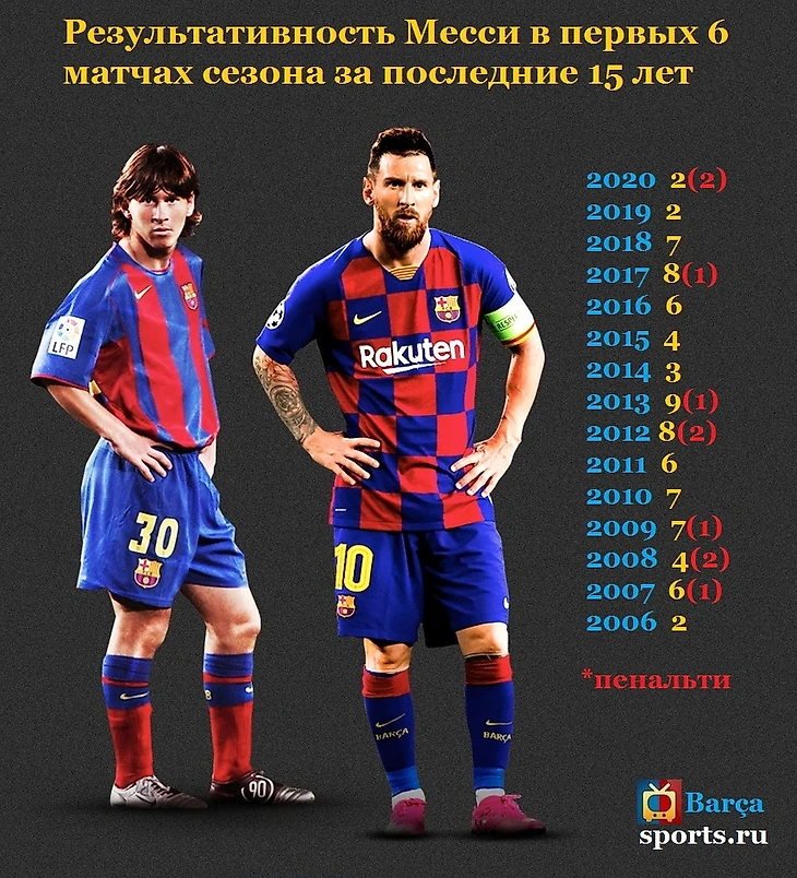 Это худший старт сезона в его карьере, с того момента, когда он стал игроком основы. В 2006-м и 2019-м у Месси тоже было 2 гола в первых 6 матчах, но при этом в обоих случаях голы были забиты с игры. Плюс ко всему в прошлом году Лео вкатывался в сезон после травмы, поэтому только три из своих шести стартовых поединков он провел целиком.