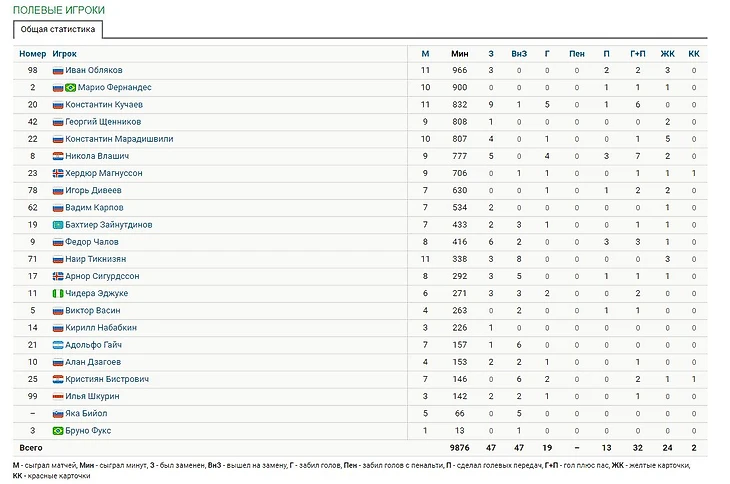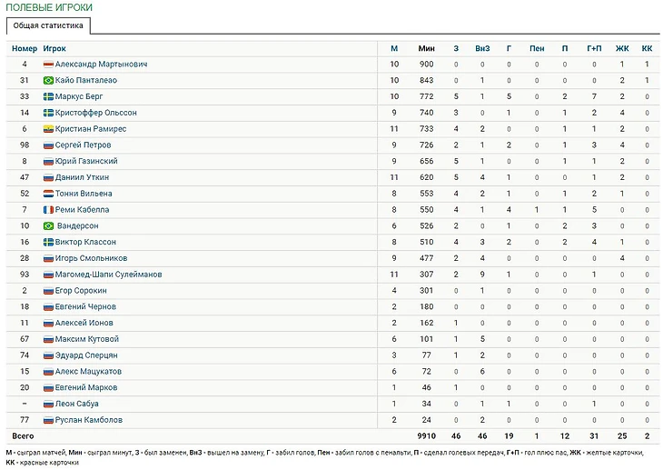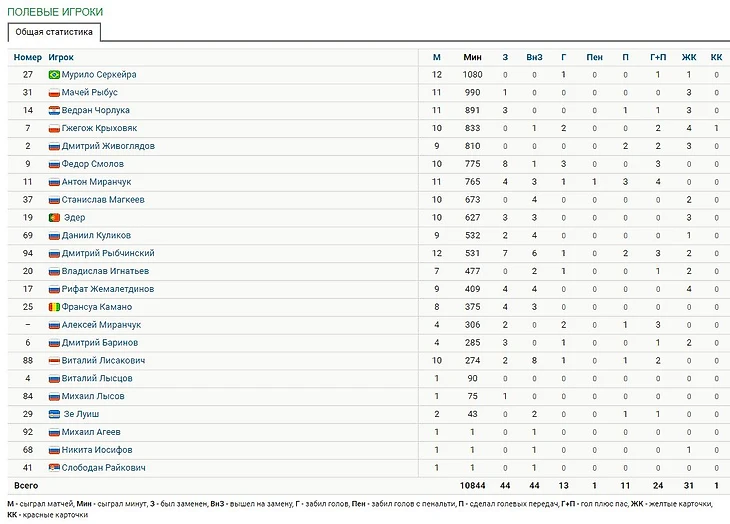 В ЦСКА так же никто не добрался до отметки в 1000 минут, при этом 21 полевой игрок появился на поле не менее 3 раз в сезоне (в «Зените» таких 17):