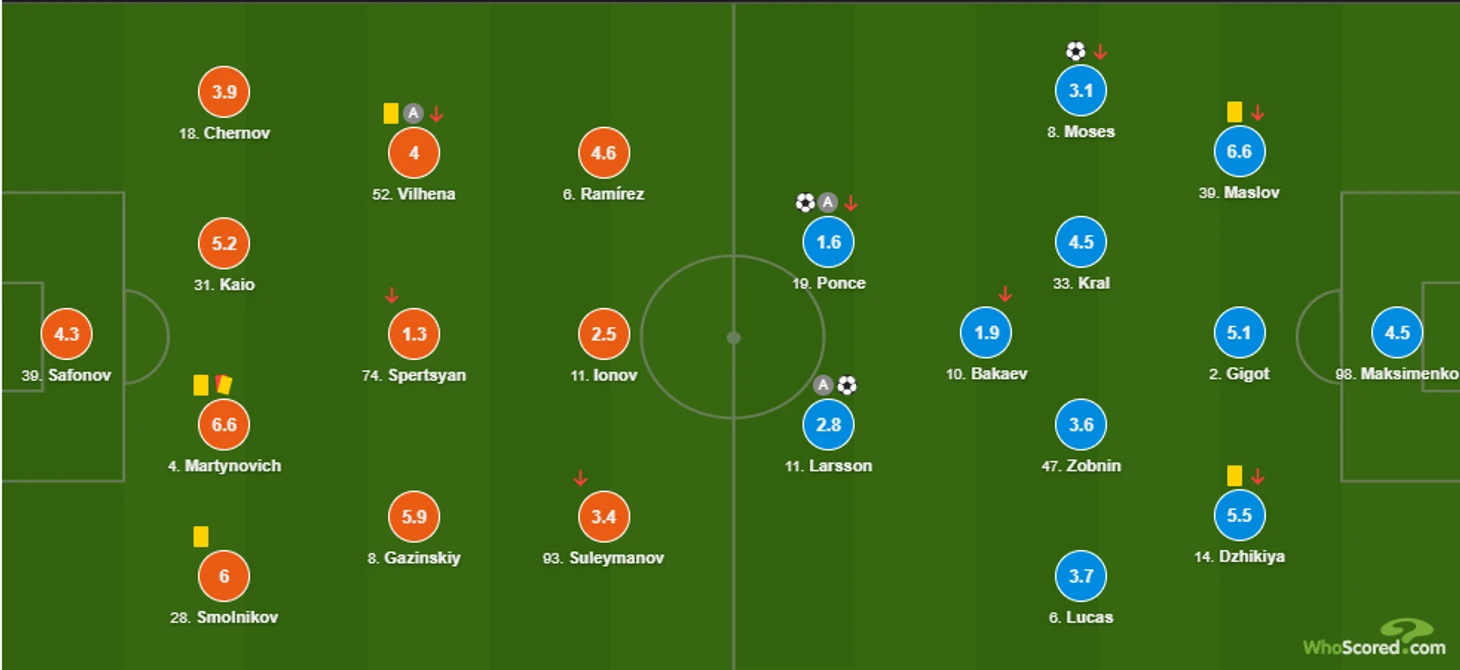 Во время одного из таких вовлечений случился первый гол в матче - Айртон перехватил мяч, отдал его Бакаеву, а тот зрячим забросом направил мяч дальше Ларрсону. Швед развернулся, и отдал Понсе - 0:1