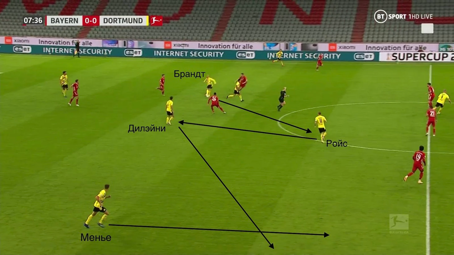Брандт опустился к центральным полузащитникам, сделал пас Ройсу, который открылся между линий и откатил мяч Дилэйни. Датчанин пасует в недодачу разогнавшемуся Менье.