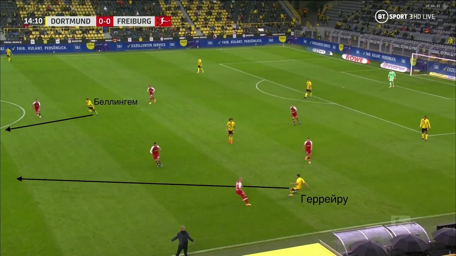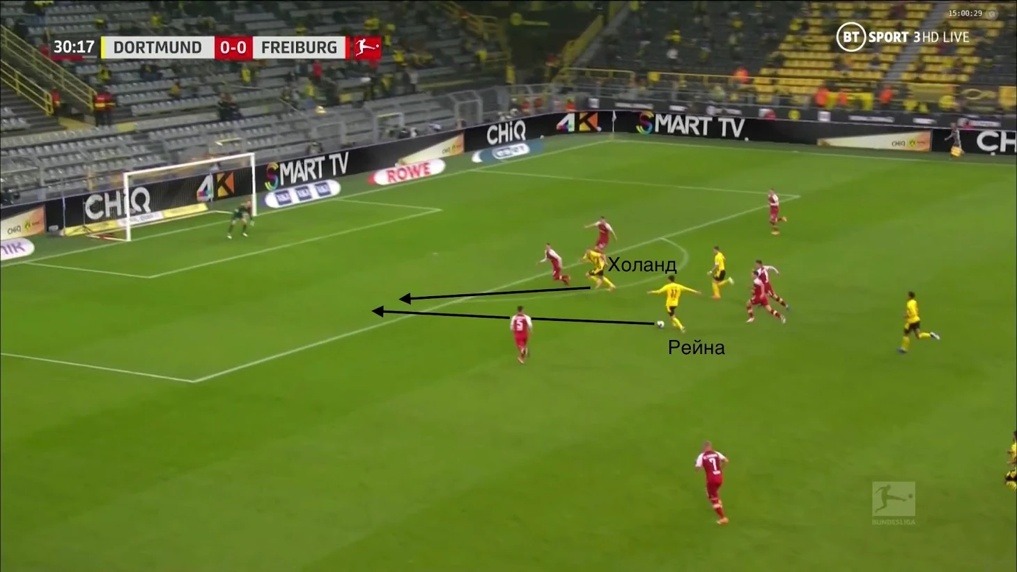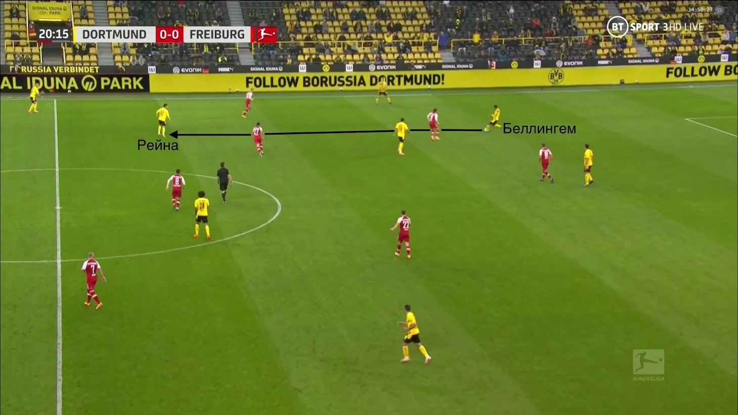 Холанд переводит мяч на фланг Ройсу, и Джуд видит свободную зону, которая оголилась из-за движения защитника «Фрайбурга» за нападающим Дортмунда. Ройс отдает не самый точный пас – другой защитник, бегущий страховать, успевает накрыть Беллингема.