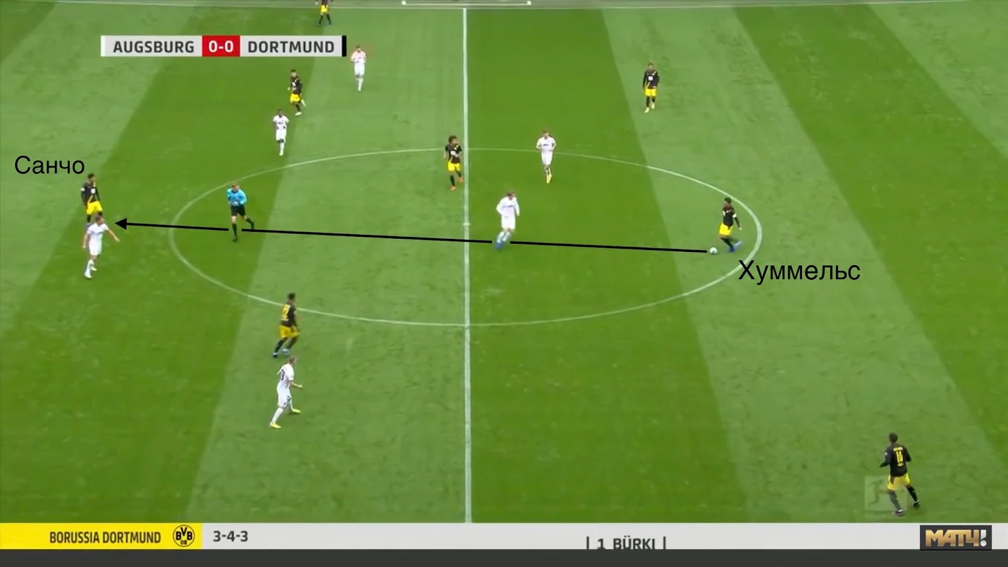 Функционалы Санчо и Рейны похожи, но перед Фавром не возникает вопросов о дублировании ролей – нет ничего страшного в двух креативных и техничных футболистах, учитывая, что их функции разнообразны и необходимы как при владении, так и в контратаках. Проблема в том, что Санчо не дает такого объема работы. Он меньше прессингует, когда Дортмунд отходит назад, реже спускается в центр поля для движения из глубины. Кажется, что Санчо необходим либо хороший ассистент в центре поля, способный продвигать мяч, либо активный латераль – Менье пока слабо сыгран с Джейдоном, поэтому справа Дортмунд чаще обостряет индивидуальными действиями, нежели качественной командной игрой.