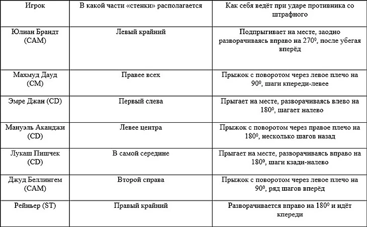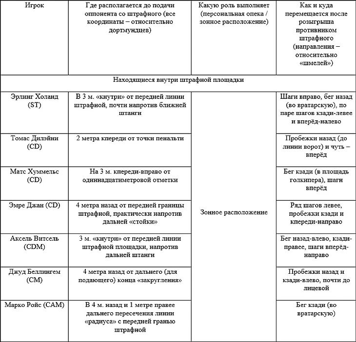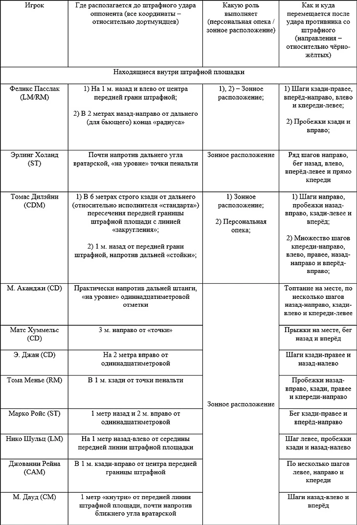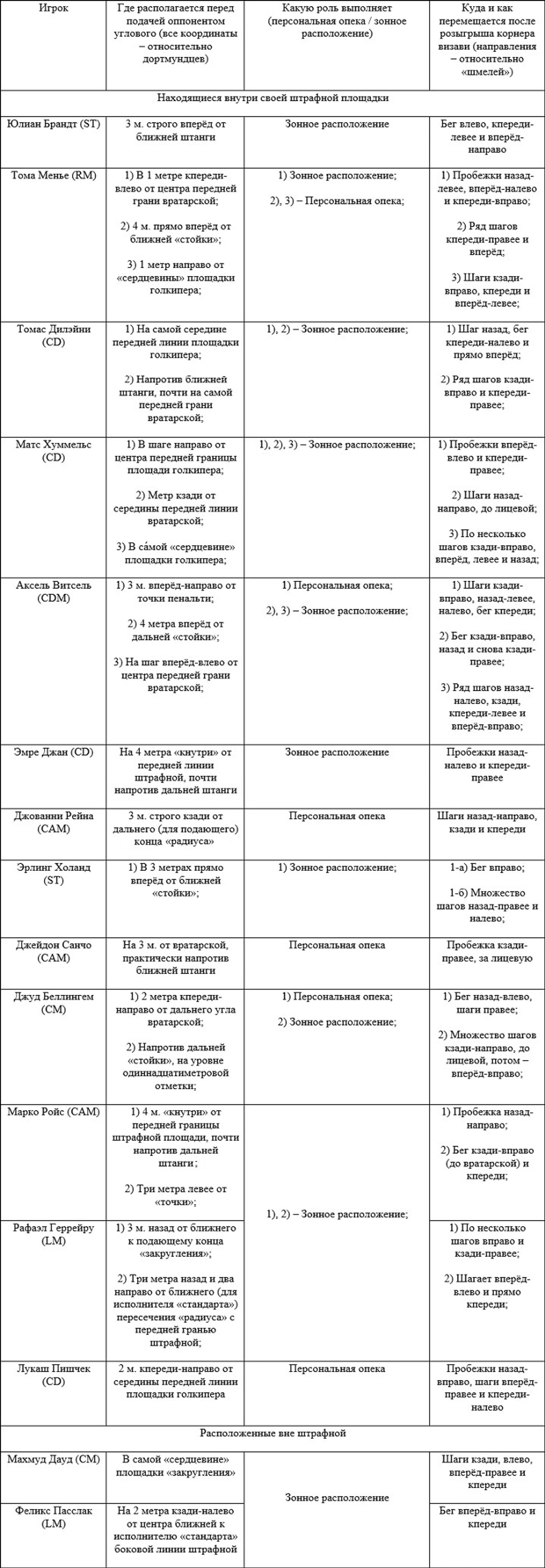 Несколько опасны для «шмелей» и стандартные положения оппонентов. Говоря конкретнее, остроту возле «рамки» Марвина Хитца чуть проще создать благодаря подаче корнера. Особенно, если сделать её в районы недалеко от ближней штанги: в точку на семь метров строго назад (для противников дружины Фавра) от названной «стойки»; либо к участку в 1 м. кпереди и трёх метрах вправо (всё – относительно соперников немцев) от ближнего угла вратарской. Данные навесы должны следовать тем футболистам, которые будут находиться под присмотром Дилэйни или Д. Санчо. В борьбе с ними «на втором этаже» желательно постараться переправить мяч в левую от Хитца «шестёрку». Предпочтительнее именно подавать корнеры, ибо, как показывает практика, долгим сложным розыгрышем низом или «сухим листом» голкипера германцев с его одноклубниками смутить крайне тяжело. Для более же верной реализации моментов у владений «Боруссии» с углового необходимо знать локализации её игроков в рассматриваемых ситуациях, а также последующие движения чёрно-жёлтых. Разобраться со всеми этими тонкостями поможет данная таблица: