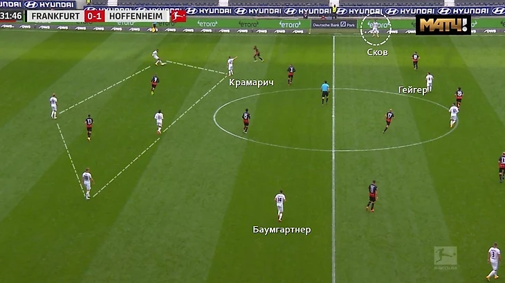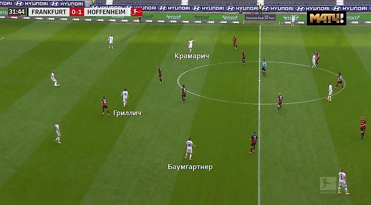 Правда, напрямую Крамарич тут не задействован: Акпогума отдаёт во фланг чуть опустившемуся под передачу Скову. Но важно, что Баумгартнер и Крамарич всё это время занимают активные позиции, оттягивая на себя внимание как минимум двух полузащитников «Айнтрахта» и не давая им принять активное участие в прессинге, что позволяет защитникам относительно спокойно разыгрывать мяч.