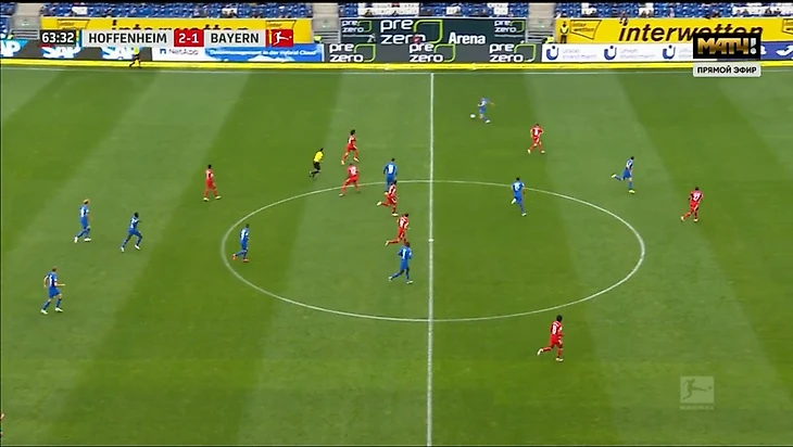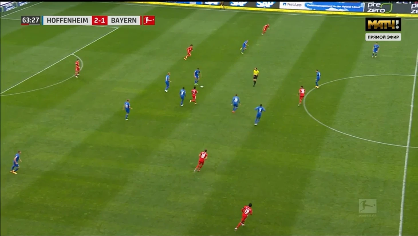 «Хоффе» отыгрывает линию полузащиты «Баварии» и в какой-то момент получает преимущество 3-в-3 на чужой половине…
