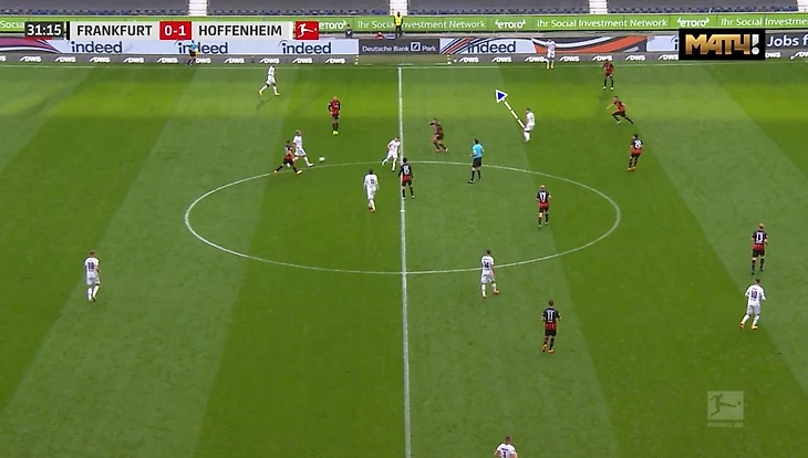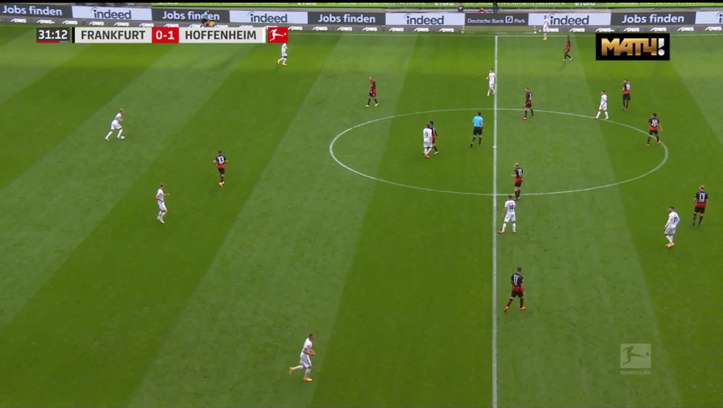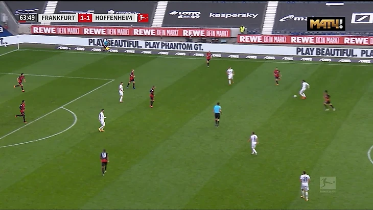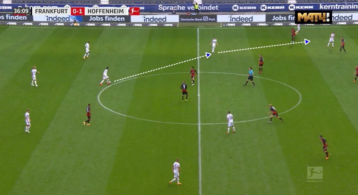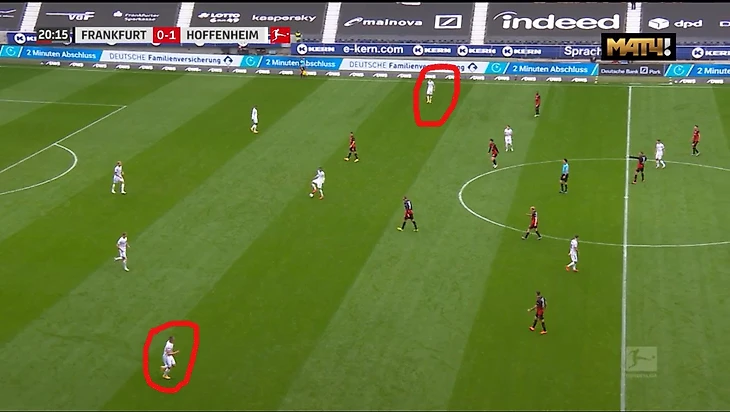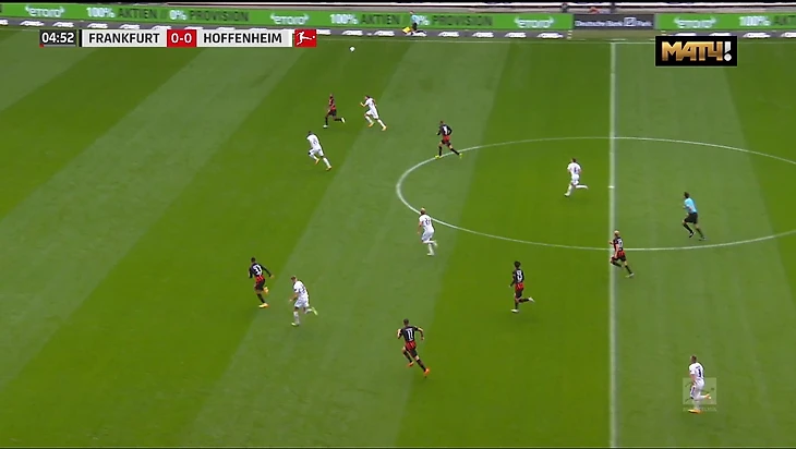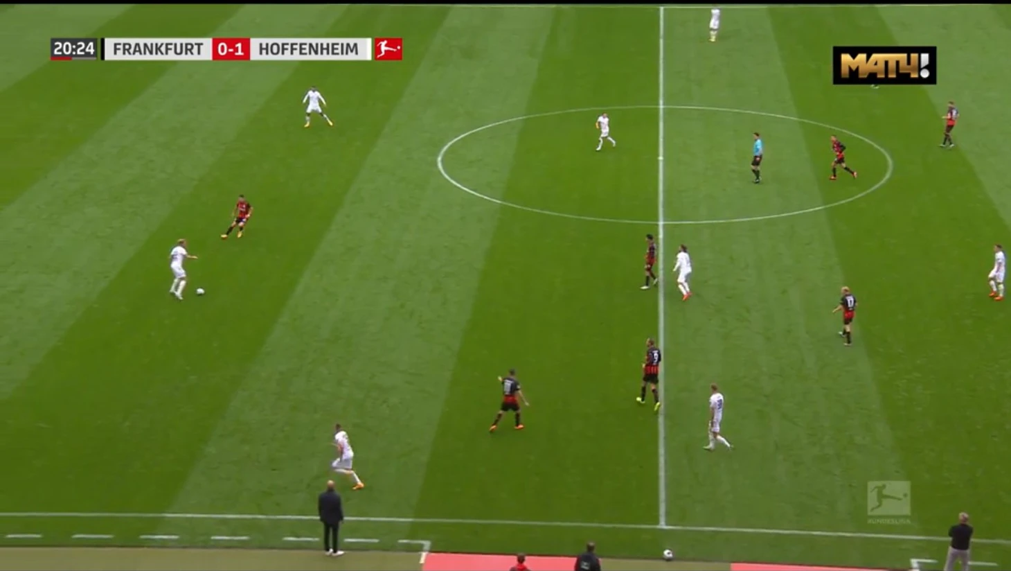 Примечательно, что, в отличие от предыдущего эпизода, Сков и Кадержабек располагаются близко к бровке и высоко. То есть, изначально планировался выход из обороны именно через центральную ось, а латерали должны здесь поддерживать атаку уже в следующих фазах, в том числе открываясь под потенциальную передачу на среднюю дистанцию из центрального круга и рассчитывать на то, чтобы противодействовать защитной линии противника с помощью своих скоростных качеств. Кроме того, Сков уже занял позицию между линиями соперника, и Кадержабек тоже к этому стремится. За счёт того, что хавбеки «Айнтрахта» вступают в прессинг при розыгрыше мяча в середине поля, вингбэки «Хоффе» теоретически могут воспользоваться образовывающимся, пусть и небольшим, но всё же разрывом в построениях соперника. Здесь происходит что-то похожее, и после розыгрыша на левом фланге следует передача вдоль бровки на Скова.