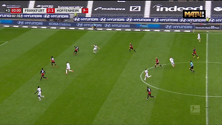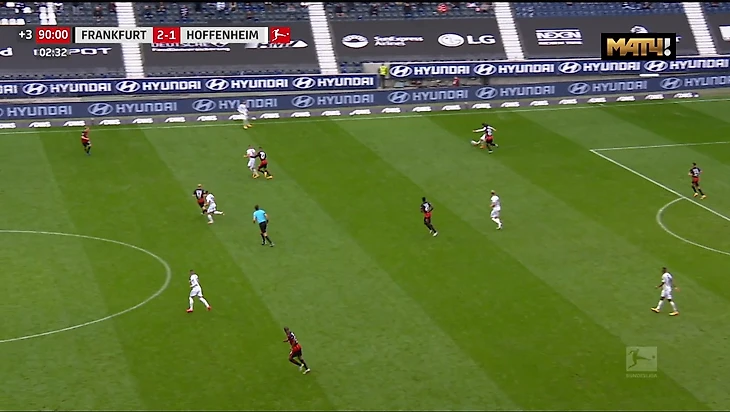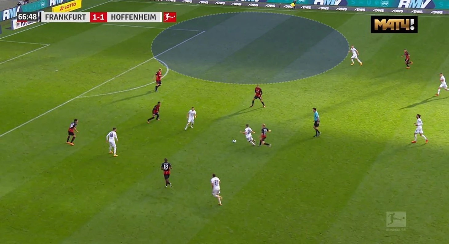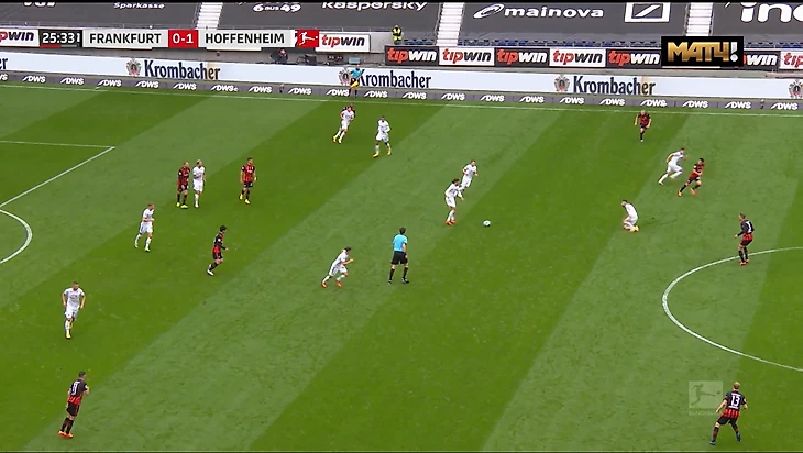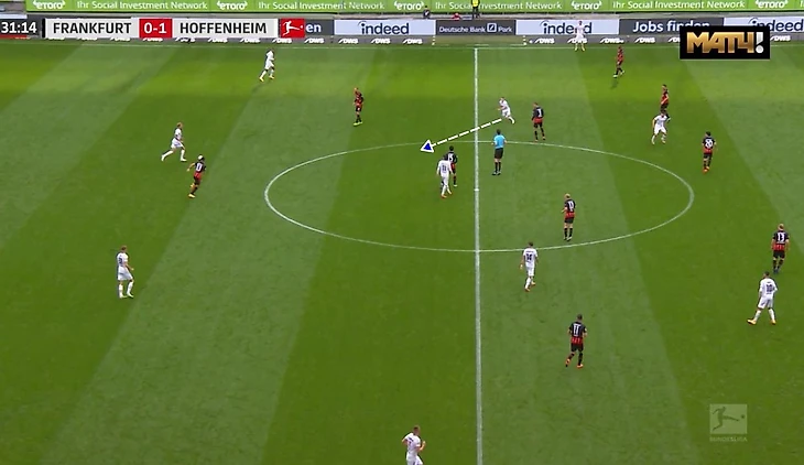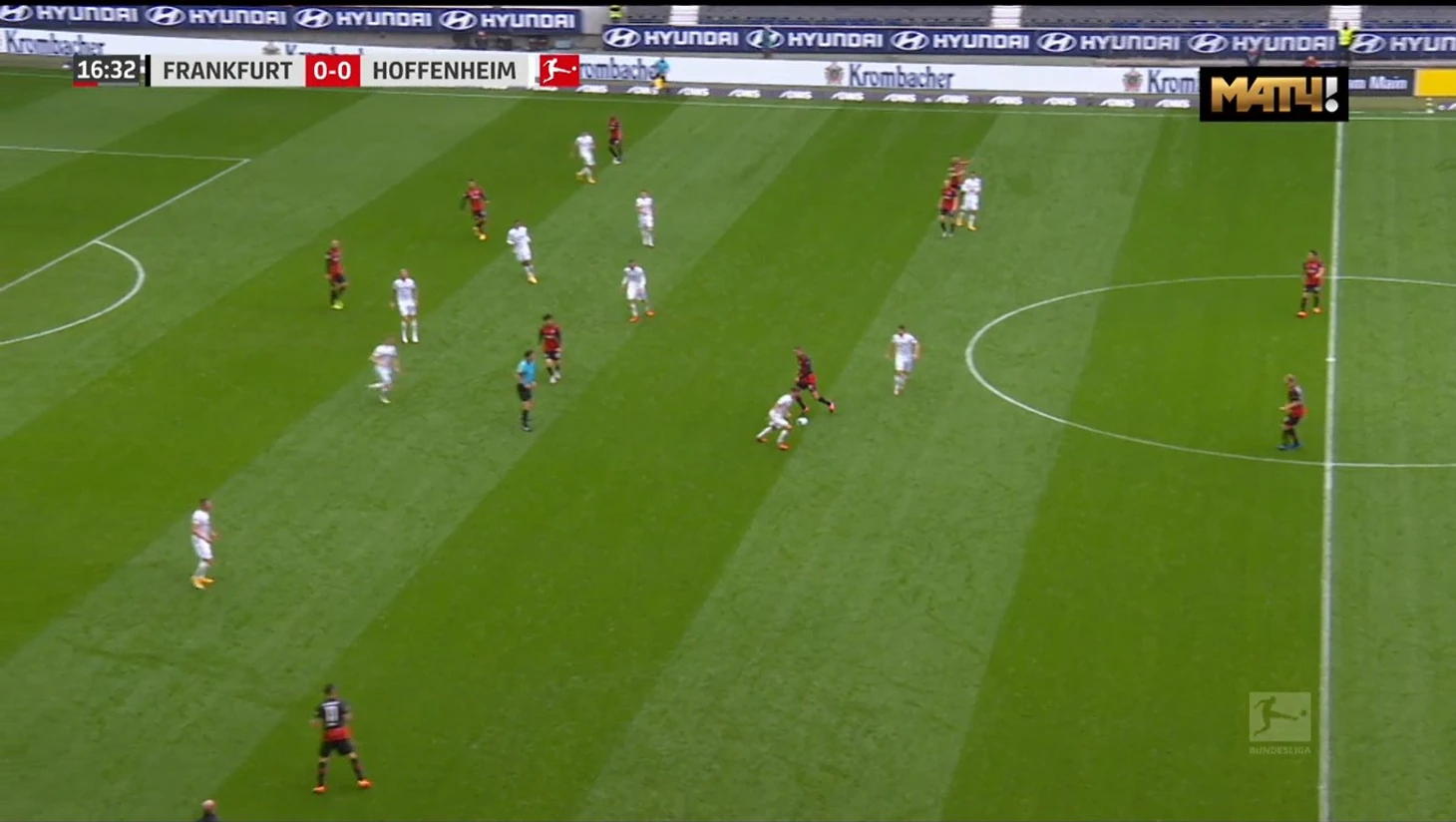 На правом фланге «Айнтрахт» включает прессинг, но «деревенские» совершенно спокойно переводят мяч на свободный левый край