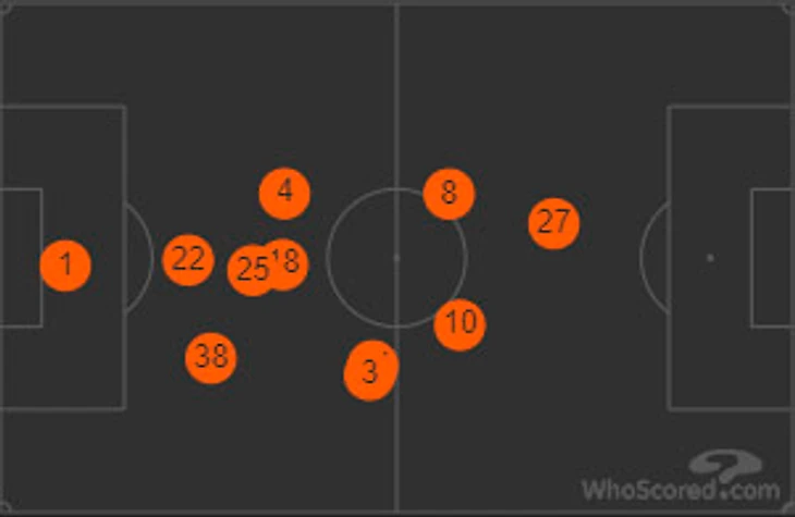 Как только хавбеки оттягиваются, а крайние игроки занимают позиции на одной линии с центральными защитниками, компактное построение позволяет спокойно отзащищаться, перекрывая максимальное количество направлений потенциальных передач и даже не пуская соперника на свою треть поля.