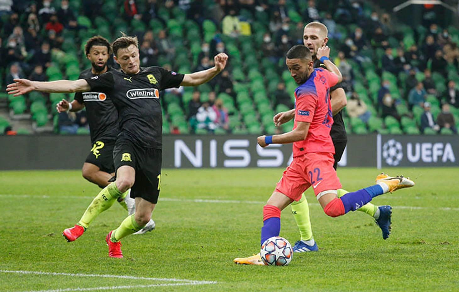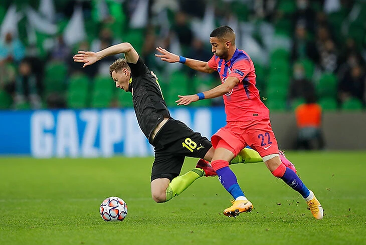 «Челси» мог выходить из-под давления через перевод на противоположный фланг (чаще «Краснодар» запирал гостей в зоне Зума и Аспиликуэты, поэтому диагонали шли на Чилуэлла), но серьезные проблемы доставлял не ими, а уходами Зиеша в середину и подключениями Аспиликуэты.