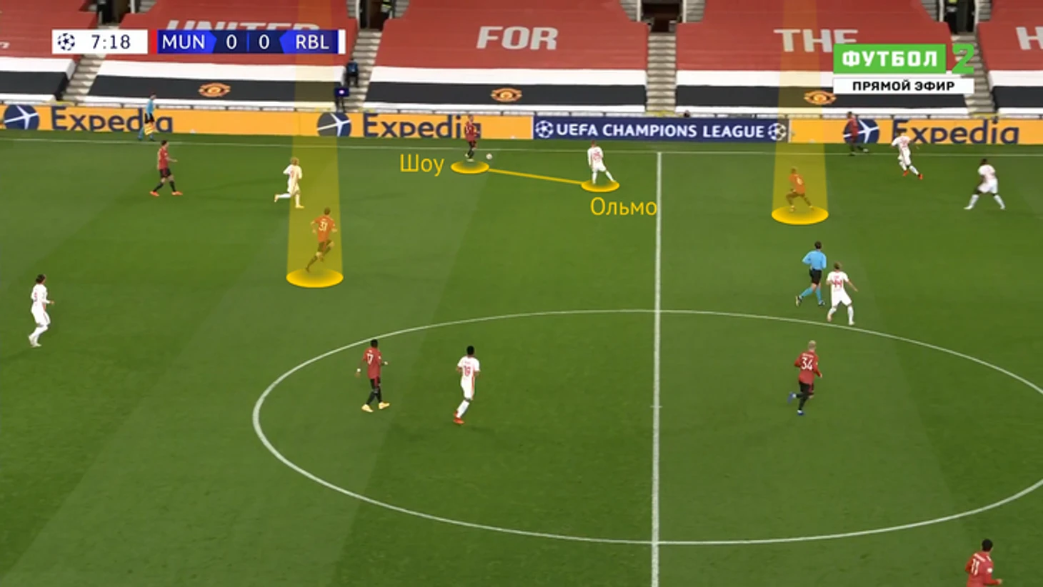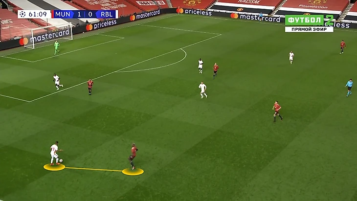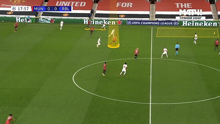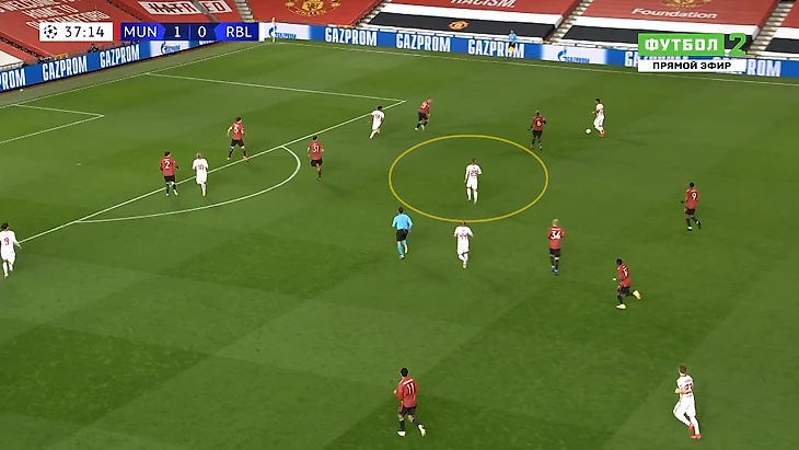 Конкретно в атаке «Лейпциг» использовал численный перевес на фланге – там у «Юнайтед» все еще было по одному игроку, «РБ» после перестановок Нагельсманна получил по второму. «МЮ» постоянно приходилось выбирать, кого стягивать на края – благодаря этому «Лейпциг» получил преимущество в динамике.