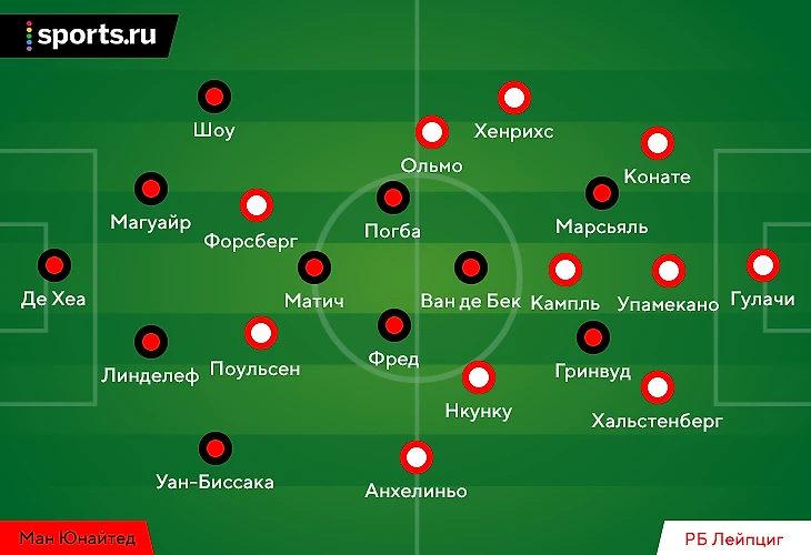 Несмотря на такие вводные, Сульшеру все же удалось удивить. Дело не только в наполнении состава (Бруну и Рэшфорд остались в запасе), но и в расстановке. «Юнайтед» впервые в сезоне выставил 4-4-2 с ромбом в полузащите. Схема хорошо знакома составу – в первом сезоне в «МЮ» Сульшер часто использовал ее под топ-матчи. Возможно, окончательно убедиться в выборе помогла последняя игра «Лейпцига» в Бундеслиге – до удаления «Герта» тоже играла по этой системе и неплохо сдерживала «РБ».