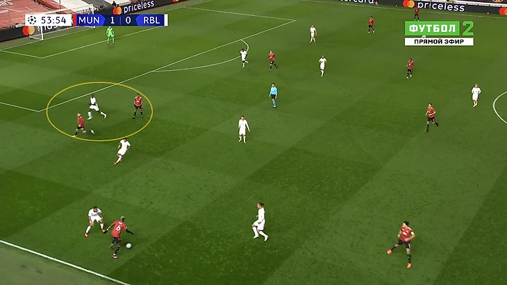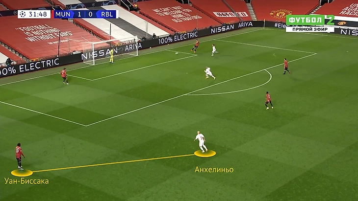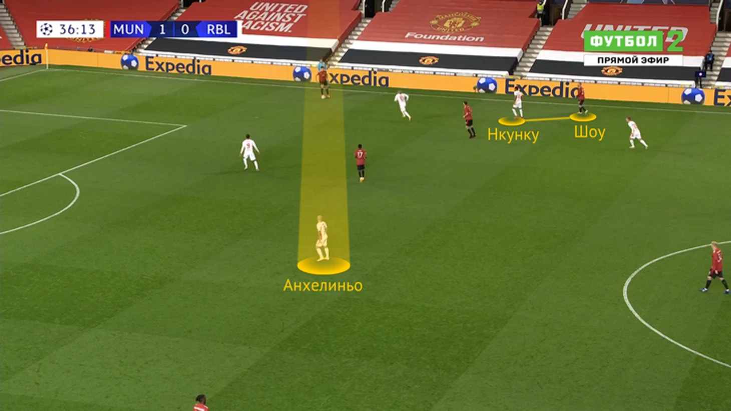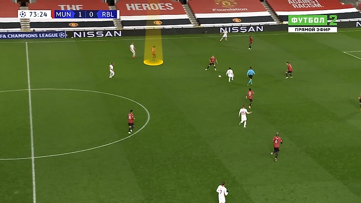 До конца решить вопрос у «Лейпцига» все равно не получилось – Форсберг и Поульсен не могли так дисциплинированно выполнять задачу в каждом моменте. Поддерживать их приходилось либо одному из центральных полузащитников (Ольмо, Нкунку), либо латералю (Хенрихс, Анхелиньо). Независимо от сценария, «МЮ» получал преимущества.