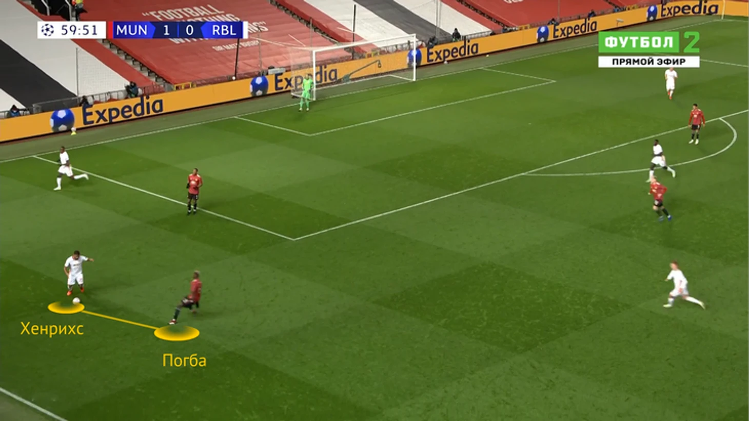 Понятная механика позволила «Юнайтед» даже вернуться к прессингу. Особенно хорош в этом был Погба. Поль не давал Хенрихсу начинать атаки через свой край. Картина с коротким розыгрышем «Лейпцига», который заканчивается на правом фланге, повторялась пугающе часто для гостей.