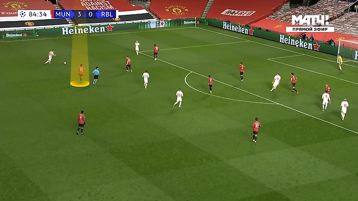 А это атака на правом фланге, где работают Уан-Биссака и Маркус Рэшфорд. Игроки «Лейпцига» разобрали их, но оставили пространство за спиной. Туда врывается вышедший на замену Бруну. Дальше португалец принимает мяч и опасно простреливает.