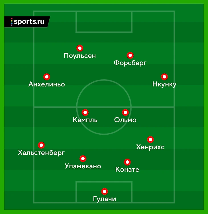Нагельсманн в этом сезоне переключался с четверки на тройку защитников. Против «МЮ» предпочел тройку. Главной особенностью стал выбор в полузащите. Позиции бокс-ту-боксов заняли Кристофер Нкунку и Дани Ольмо – очень атакующая связка, учитывая, что оба могут сыграть на флангах. Эмиль Форсберг, который в этом сезоне вернулся в старт, начал вторым нападающим.