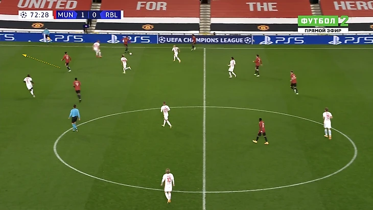 «МЮ» варьировал давление. В первой стадии у «Лейпцига» было преимущество – тройка центральных защитников (Конате, Упамекано, Халстенберг) против двойки нападающих (Гринвуд, Марсьяль). «Юнайтед» компенсировал это двумя способами. К нападающим мог выдвигаться один из полузащитников (чаще Ван де Бек, иногда – Фред) или вся команда направляла атаку «Лейпцига» на один фланг, оставляя лишнего дальнего защитника свободным.