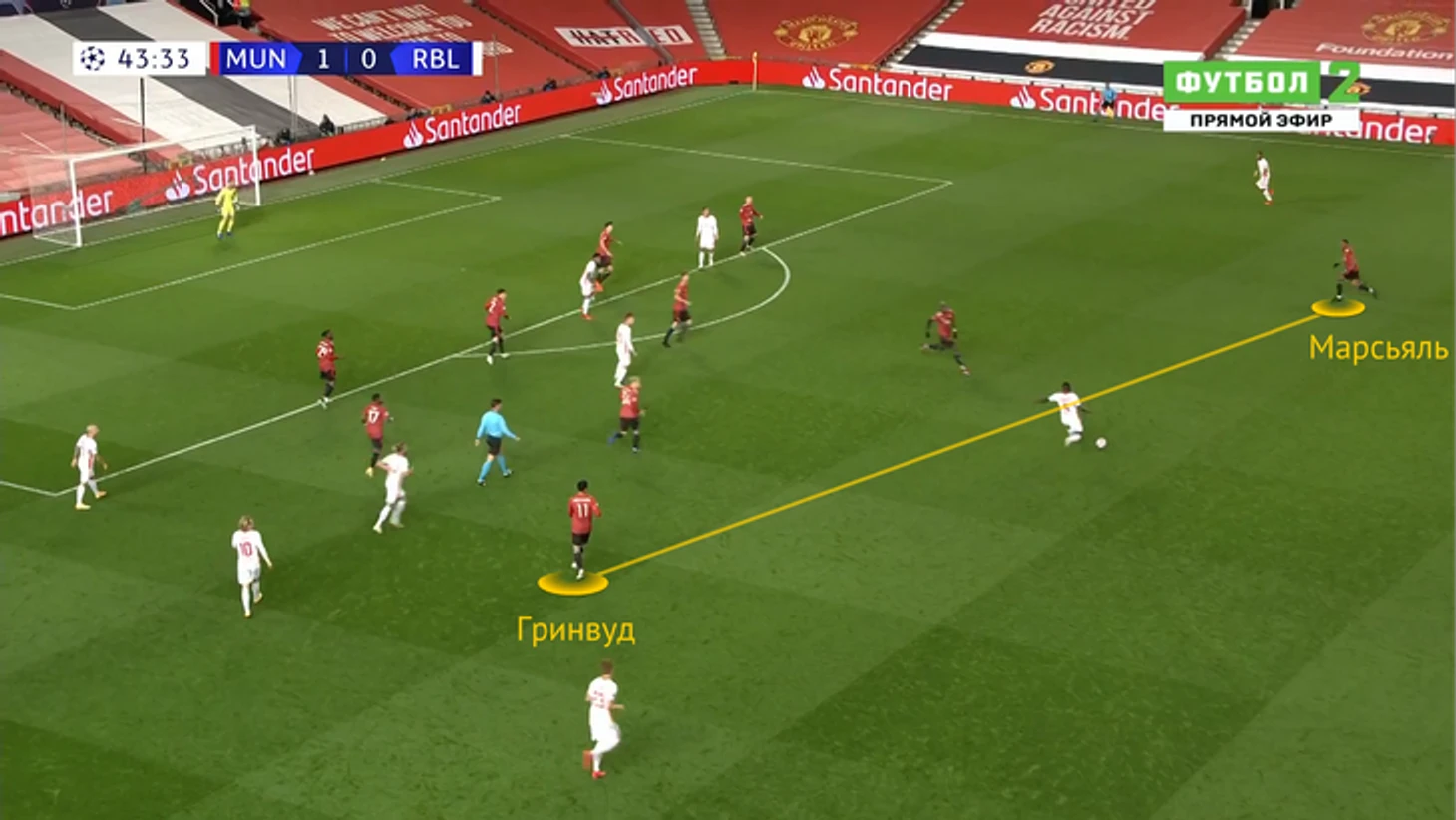 Чтобы таких моментов не возникало, опускаться глубоко назад приходилось Гринвуду и Марсьялю. Это повлияло на способность «Юнайтед» контратаковать. Даже после перехода мяча к «МЮ» нападающие находились слишком низко – «Лейпциг» накрывал контрпрессингом. В результате отрезок от гола Гринвуда и до перерыва «РБ» выиграл со счетом 6:0 по ударам.