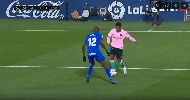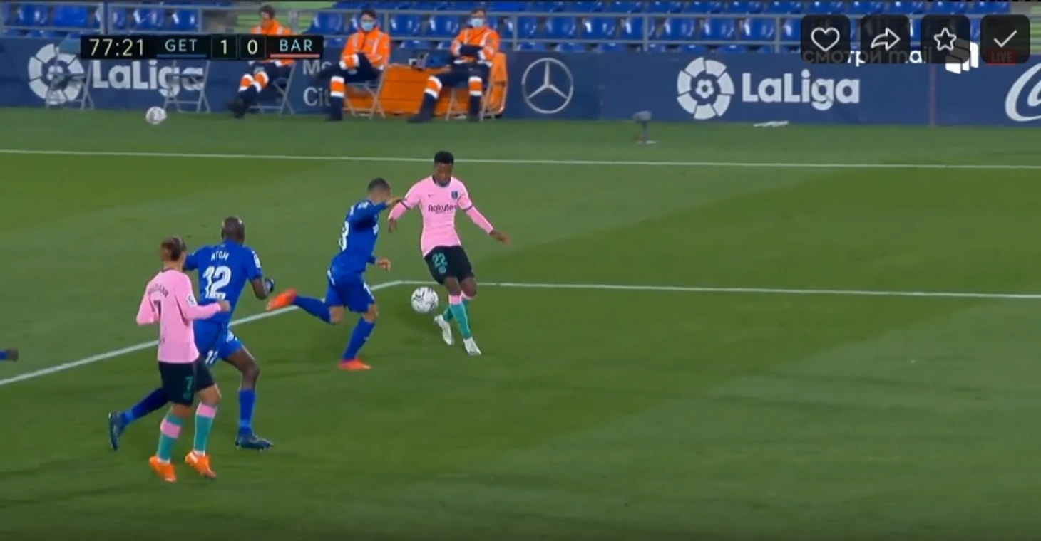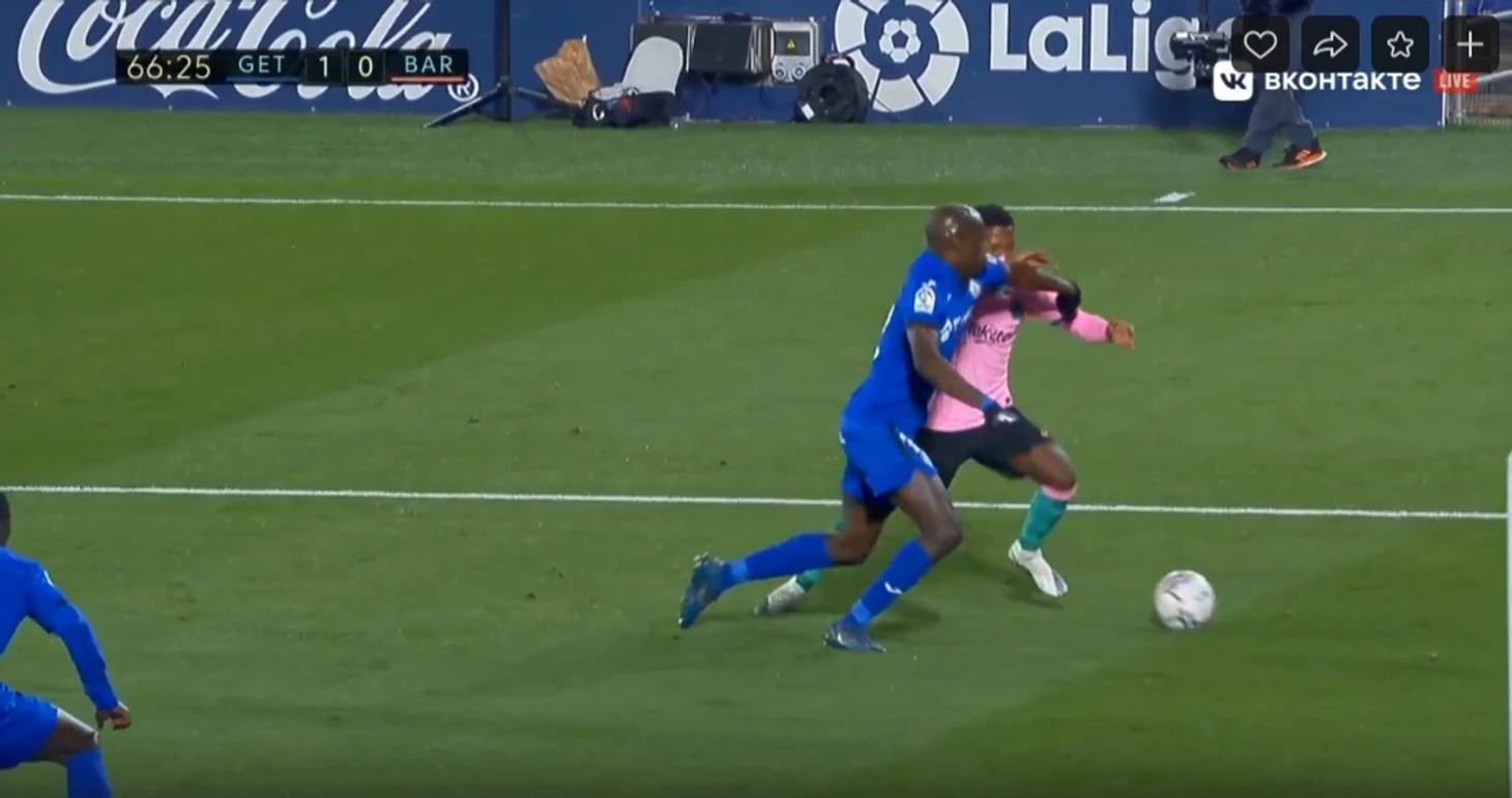 Арамбари с нарушением правил атакует Фати, врезаясь в корпус нападающего "Барсы".