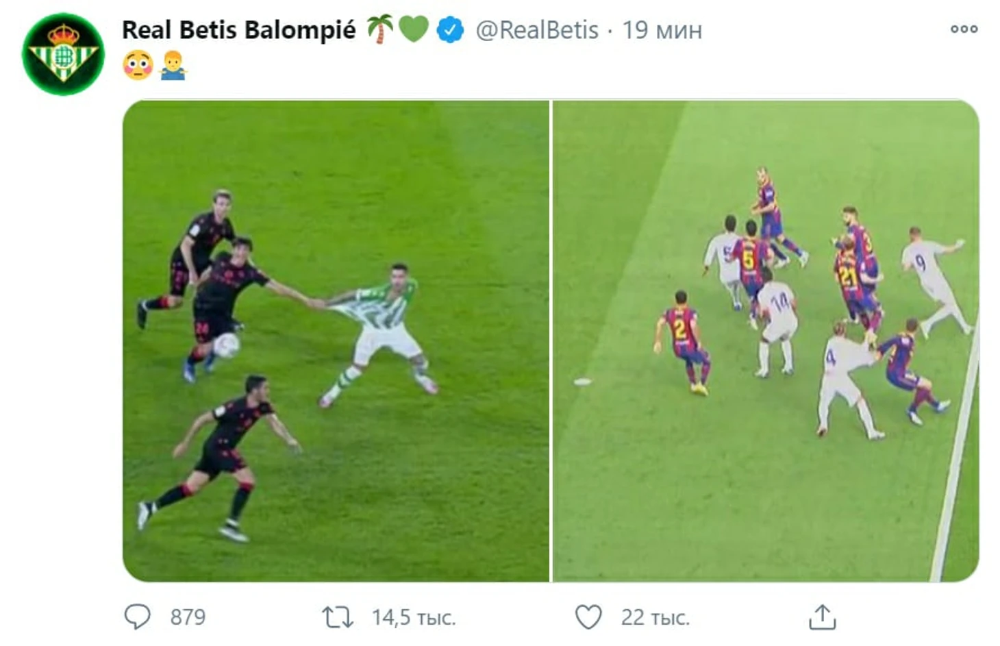 Не выдержал даже "Бетис" и напомнил всем в твиттере о том самом эпизоде в матче с "Сосьедадом", когда более явный прихват за футболку был проигнорирован. Тем самым представители "огурцов" намекнули на двойные стандарты судейства в Ла Лиге.