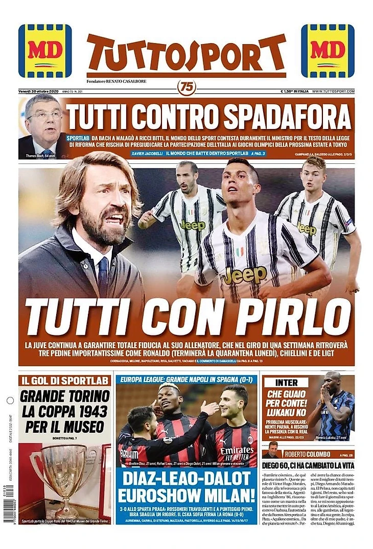 «Юве» продолжает гарантировать тотальную веру в своего тренера, который в течение недели найдёт три важнейших части команды, таких как Роналду (карантин закончится в понедельник), Кьеллини и Де Лигт.