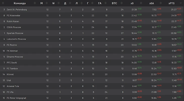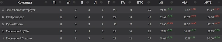 «Спартак» на первом месте по игре? «XG» таблица после 12 тура